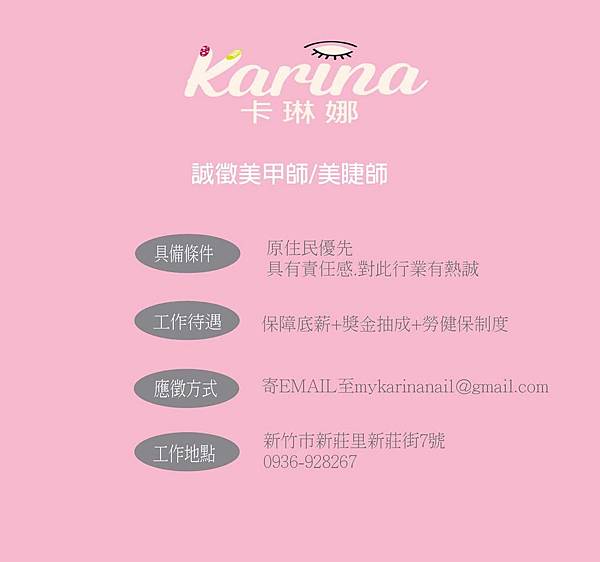 想要成為一流美睫師美甲師的機會來了📢卡琳娜美甲美睫,擴大營運 要招募新血囉! 歡迎具有責任感並且對此行業具有熱誠的妳,加 入我們的團隊💪🏻請先附上完整履歷表,及照片一張寄到:mykarinanai@gmail.com麻煩請附上相關作品及照片。